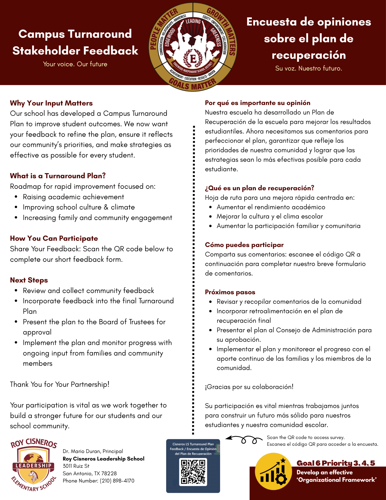 My name is Dr. Mario Duran and I am blessed to serve as the Head of School for Roy Cisneros Leadership School. This is my third year here at Cisneros and this year, my son is enrolled here. I wanted him to experience the power of what an IB education can do for a child. At Roy Cisneros, we prepare students to be confident in approaching future challenges by equipping them with leadership skills that not only focus on academic success but also on capacity building for future success. Come join us for an educational experience that will last a lifetime.
